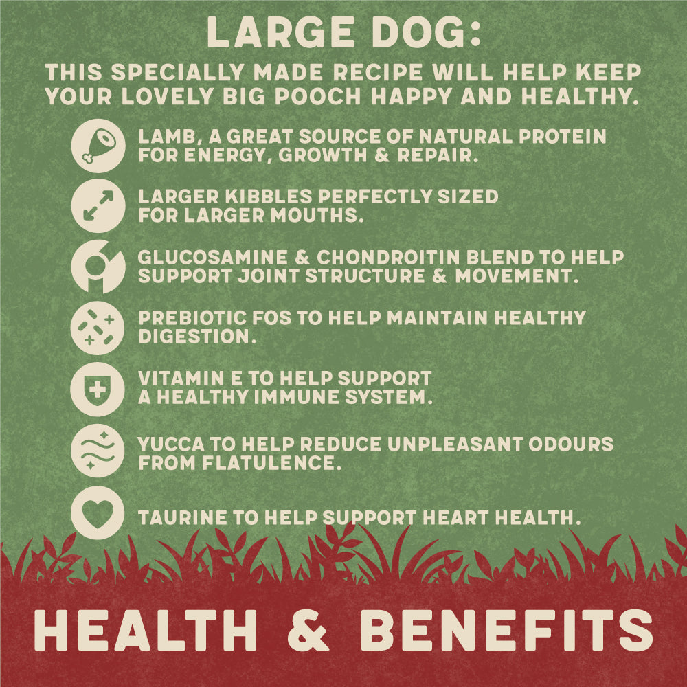 This specially made recipe will keep your lovely big pooch happy and healthy, with added benefits specific to large breed dogs such as taurine to help support heart health, glucosamine & chondroitin blend to help support joint structure and movement and larger kibbles perfectly sized for larger mouths.